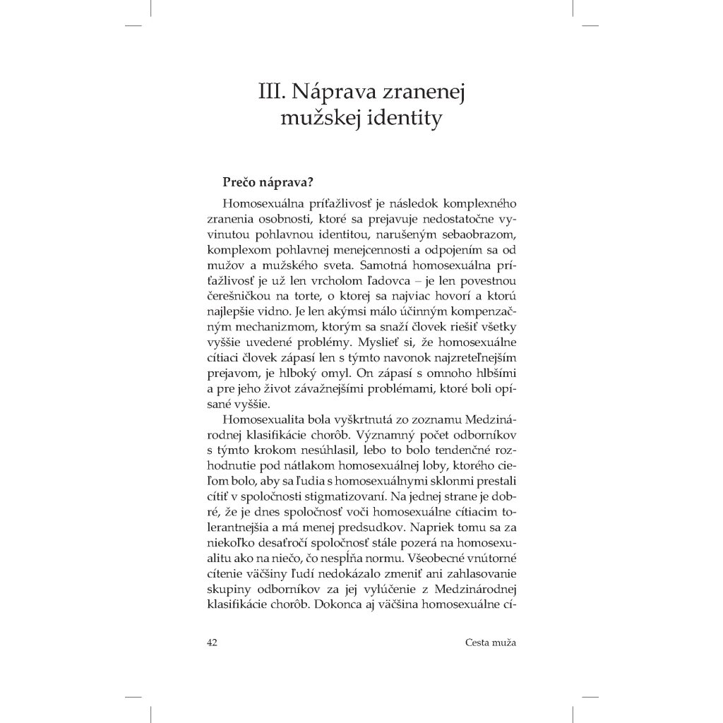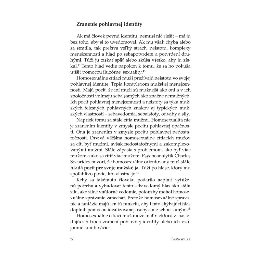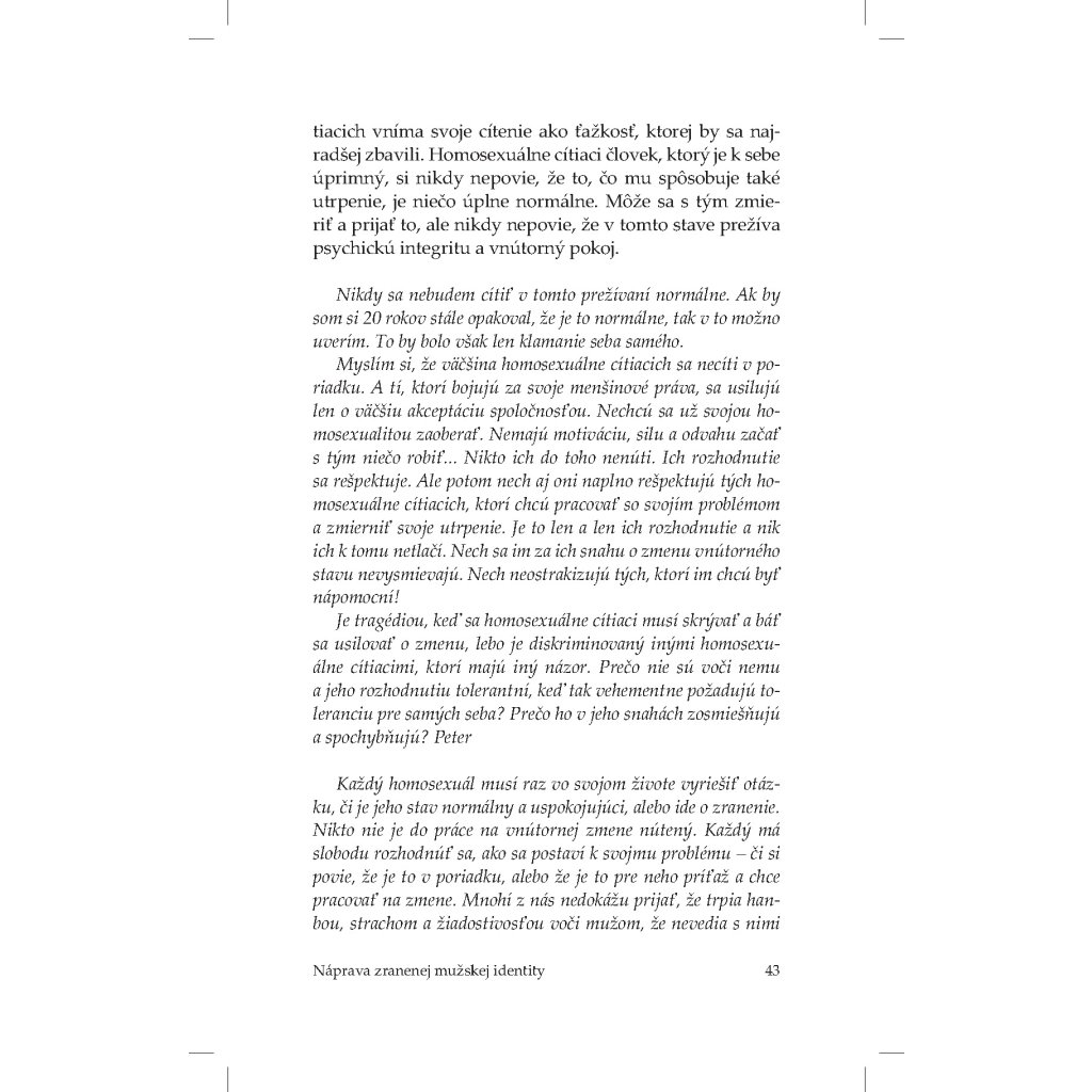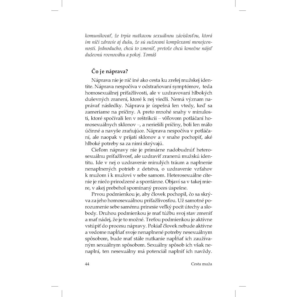 „Aj ja patrím k týmto ľuďom. Nie som teoretik ani moralista, nie som psychológ ani sociológ. Som len obyčajný muž – jeden z mnohých –, ktorý kráča s týmto bremenom. Všetko, čo píšem, som prežil na vlastnej koži. Prešiel som si všetkým – od šokujúceho zistenia, čo cítim a kto som, cez stavy zúfalstva, beznádeje a totálneho dna až po osobné vzkriesenie. Za touto knihou je skoro tridsaťročná skúsenosť, počas ktorej som hľadal odpovede na všetky „prečo“ a súčasne nachádzal spôsob a cestu, ako kráčať životom bez toho, aby som život stratil.