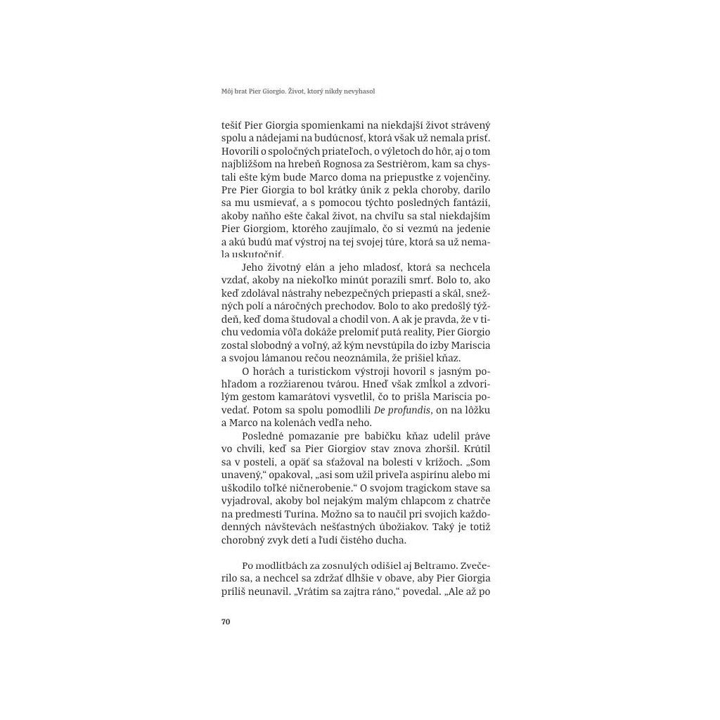 „Detailné, trpezlivé a dojímavé rozprávanie Luciany Frassati, jeho vernej sestry, nám teraz, po mnohých rokoch, sprítomňuje ten krutý týždeň osamelej a mlčanlivej úzkosti. Zviera pri ňom srdce. Bez patetických scén, nadnesených úvah a pamätných fráz čítame jednoduchú, presnú a výstižnú kroniku udalostí, ktorá sa vyhýba nadužívaniu výrazových efektov. Snáď okrem knihy, v ktorej Isabelle Rimbaud opísala posledné dni svojho brata básnika, nepoznám veľa kníh o zosnulých, ktoré by sa dokázali tak hlboko dotknúť duše čitateľa, a to aj duše tých, ktorí nepoznajú útechu prameniacu z viery.“ – Giovanni Papini