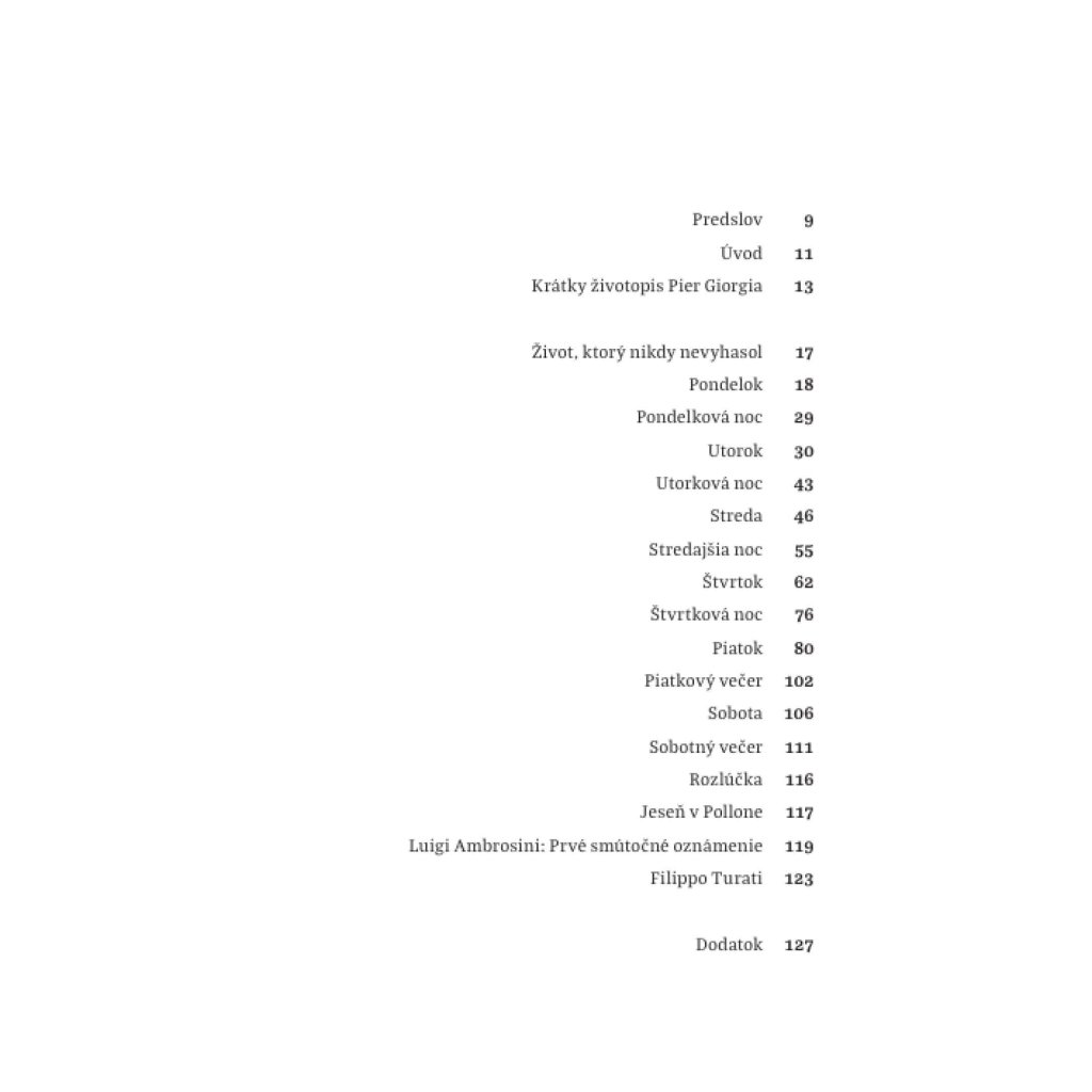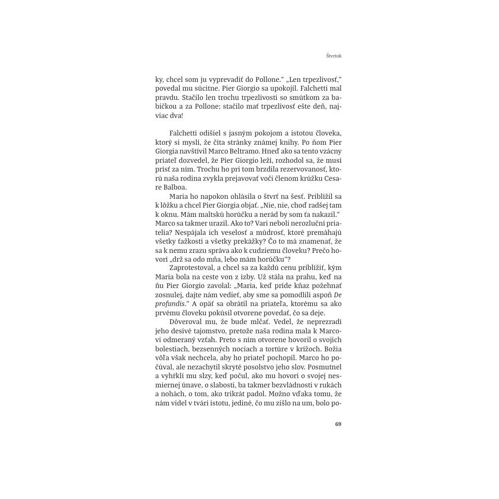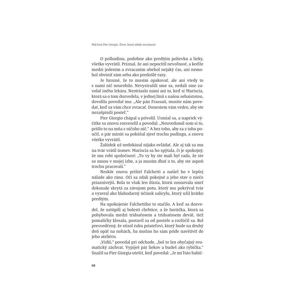 Jeho život tragicky ukončila akútna choroba v priebehu šiestich dní, ktoré v tejto knihe opisuje jeho sestra Luciana s citom pre detail, bez príkras a s tichým dojatím. Vedie pri tom čitateľa k tomu, aby sa konfrontoval s tajomným a obohacujúcim rozmerom obety.